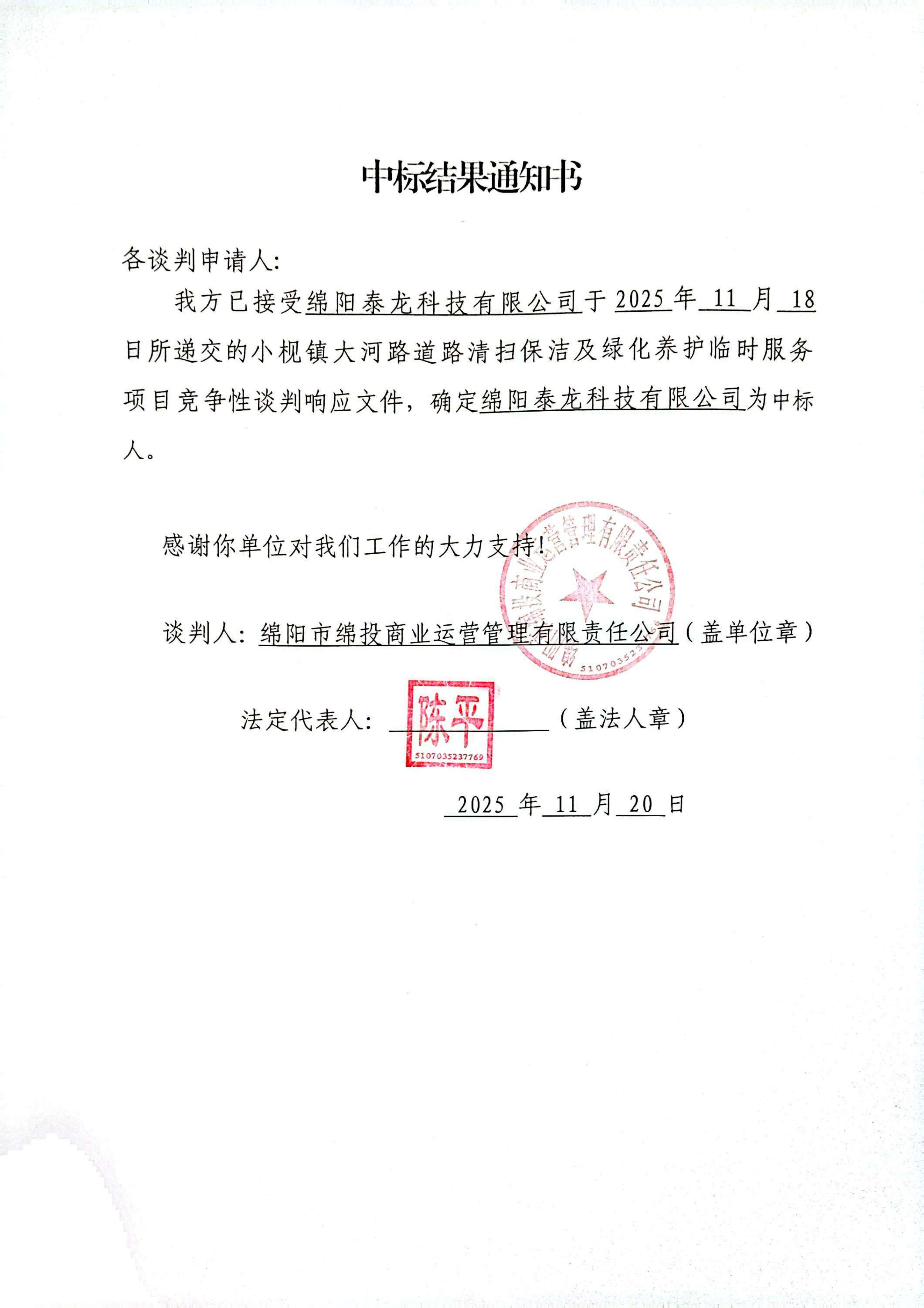 我方已接受綿陽(yáng)泰龍科技有限公司于2025年 11 月 18 日所遞交的小枧鎮(zhèn)大河路道路清掃保潔及綠化養(yǎng)護(hù)臨時(shí)服務(wù)項(xiàng)目競(jìng)爭(zhēng)性談判響應(yīng)文件,確定綿陽(yáng)泰龍科技有限公司為中標(biāo)人。