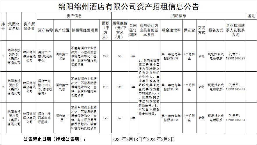綿陽綿州酒店有限公司資產(chǎn)招租信息公告