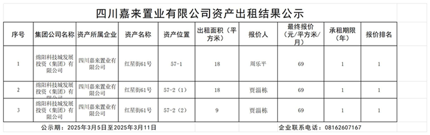 四川嘉來置業(yè)有限公司資產(chǎn)出租結(jié)果公示