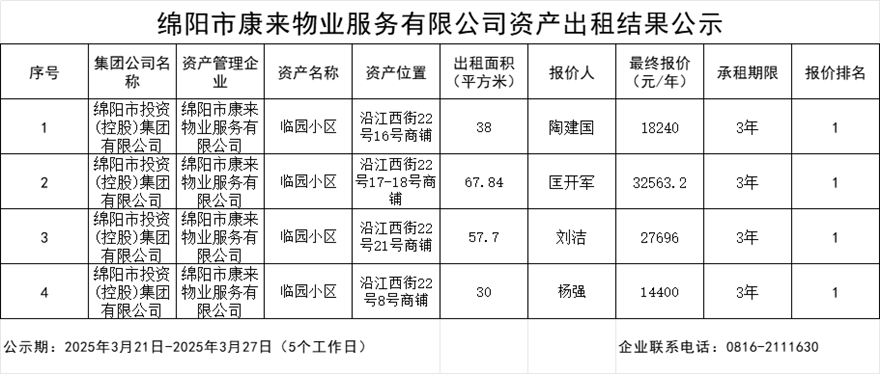 綿陽(yáng)市康來物業(yè)服務(wù)有限公司資產(chǎn)出租結(jié)果公示