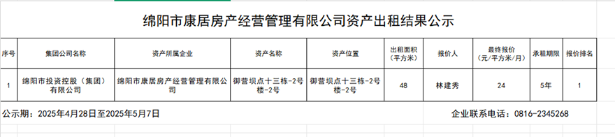 綿陽市康居房產(chǎn)經(jīng)營(yíng)管理有限公司資產(chǎn)出租結(jié)果公示