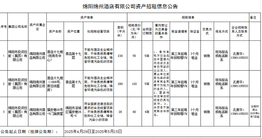 綿陽(yáng)綿州酒店有限公司資產(chǎn)招租信息公告