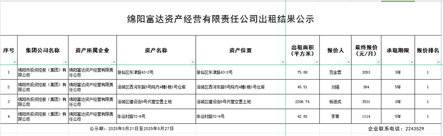綿陽(yáng)富達(dá)資產(chǎn)經(jīng)營(yíng)有限公司出租結(jié)果公示