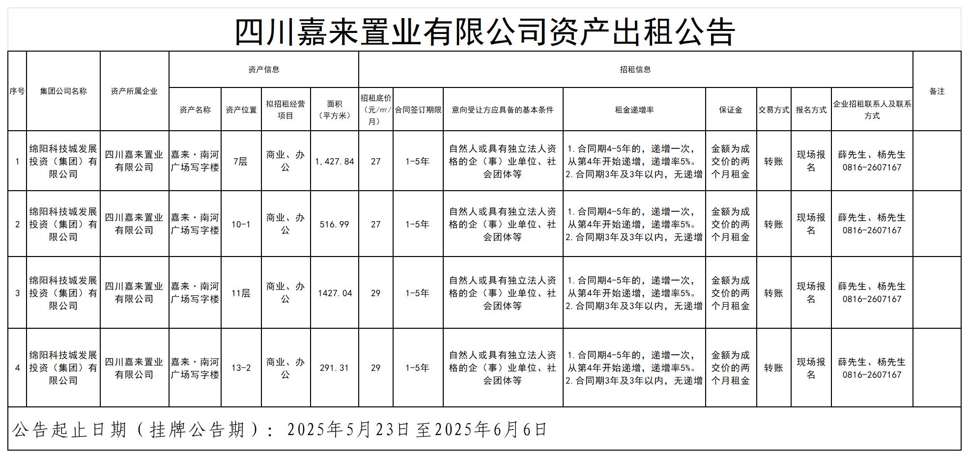 四川嘉來置業(yè)有限公司資產(chǎn)出租公告