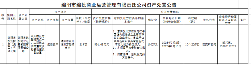 綿陽市綿投商業(yè)運營管理有限責任公司資產(chǎn)處置公告