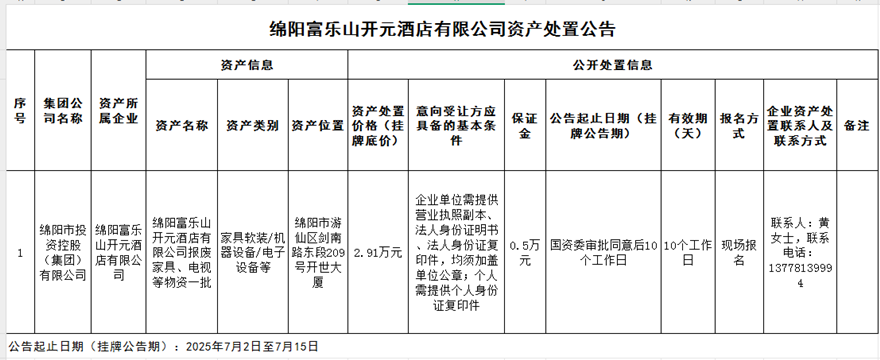 綿陽富樂山開元酒店有限公司資產處置公告