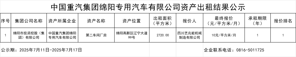 中國重汽集團綿陽專用汽車有限公司資產(chǎn)出租結(jié)果公示
