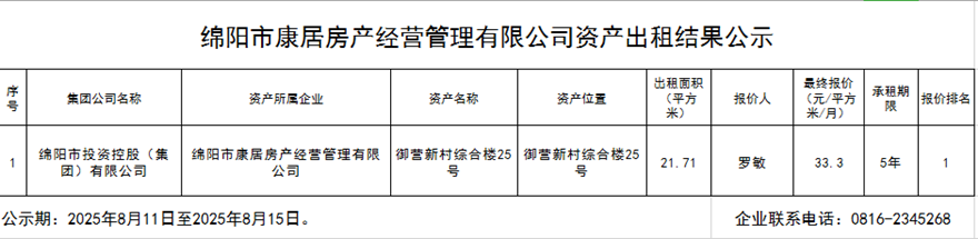 綿陽市康居房產(chǎn)經(jīng)營管理有限公司資產(chǎn)出租結果公示