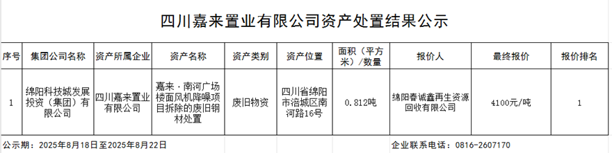四川嘉來置業(yè)有限公司資產(chǎn)處置結果公示