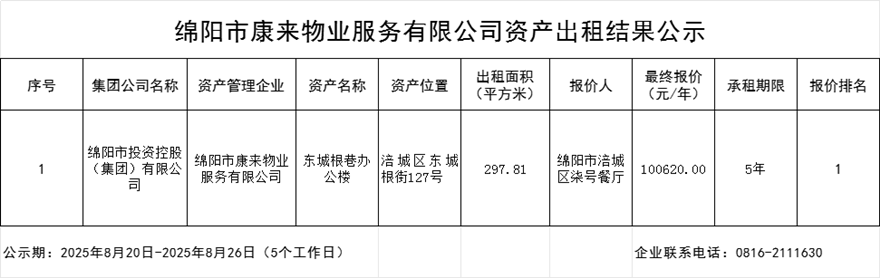 綿陽市康來物業(yè)服務有限公司資產(chǎn)出租結果公示