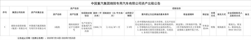 中國(guó)重汽集團(tuán)綿陽(yáng)專用汽車(chē)有限公司資產(chǎn)出租公告