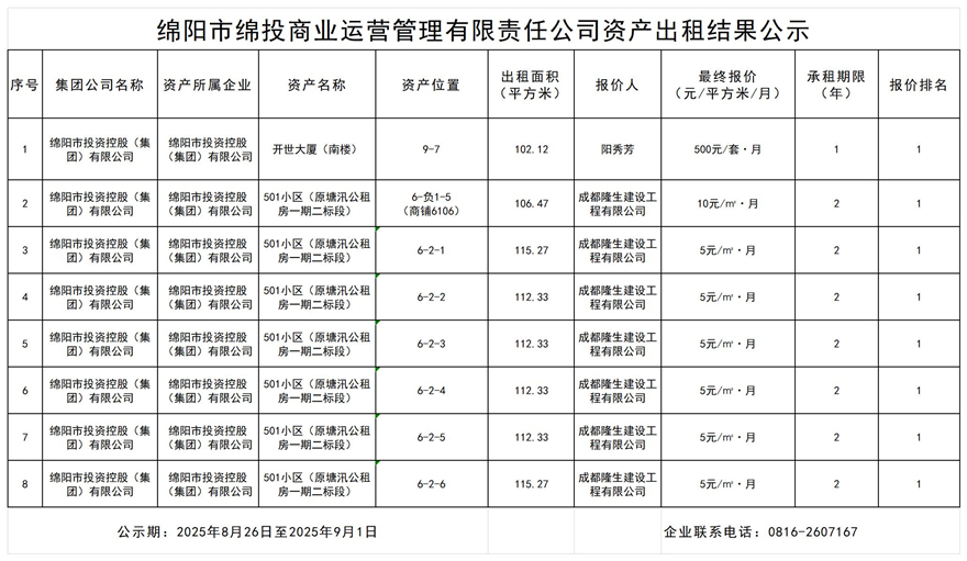 綿陽市綿投商業(yè)運營管理有限責任公司資產(chǎn)出租結(jié)果公示