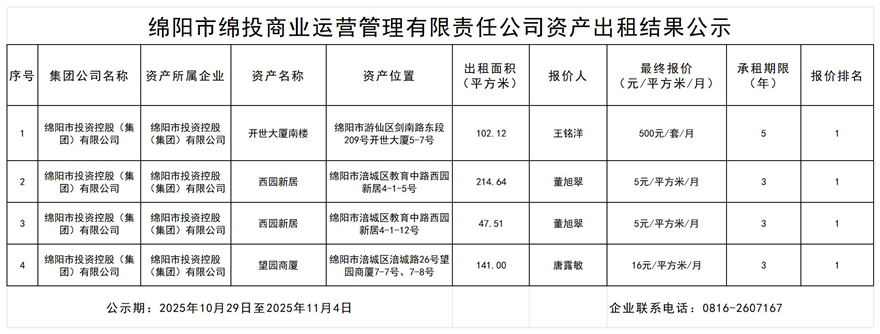 綿陽市綿投商業(yè)運(yùn)營(yíng)管理有限責(zé)任公司資產(chǎn)出租結(jié)果公示