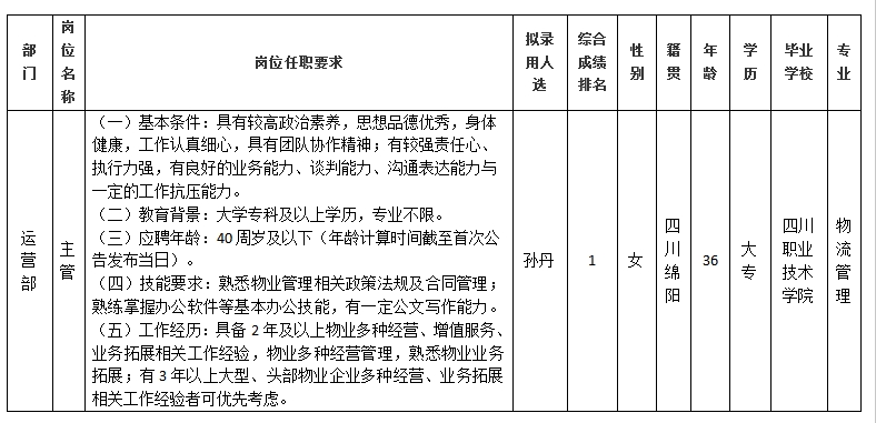 根據(jù)綿陽市康來物業(yè)服務(wù)有限公司發(fā)布的招聘公告及招聘相關(guān)規(guī)定,經(jīng)筆試、面試、背景調(diào)查等程序,擬錄用孫丹同志到綿陽市康來物業(yè)服務(wù)有限公司運營部工作,現(xiàn)予以公示,具體情況如下: