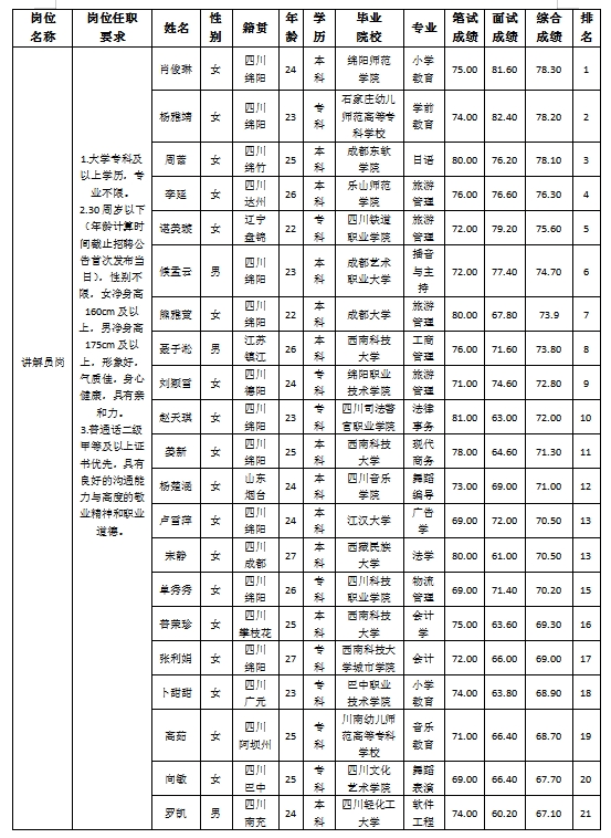 【公開招聘】四川越王樓文化傳播有限公司關(guān)于招聘講解員崗位測(cè)試成績(jī)的公示