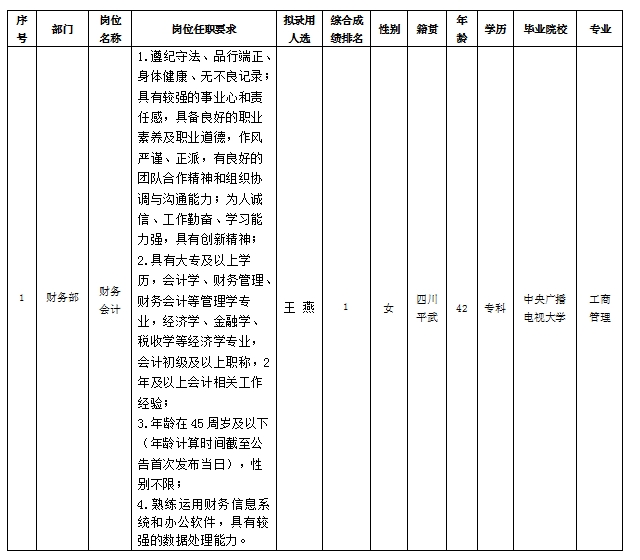 根據(jù)綿陽(yáng)市綿州嘉來(lái)會(huì)務(wù)服務(wù)有限公司發(fā)布的招聘公告及招聘相關(guān)規(guī)定,經(jīng)筆試、面試、考察、體檢等程序,擬錄用王燕同志到財(cái)務(wù)部工作,現(xiàn)予以公示,具體情況如下: