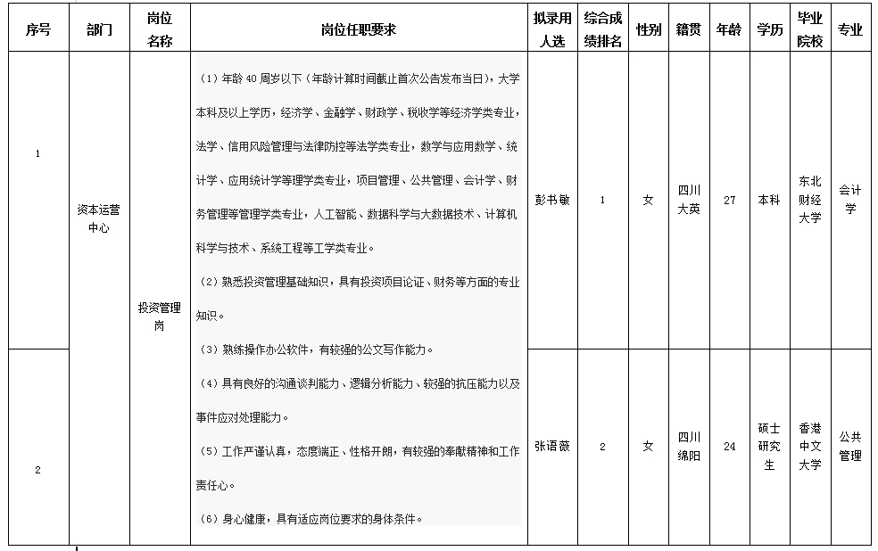 根據(jù)綿陽市投資控股(集團)有限公司發(fā)布的招聘公告及招聘相關規(guī)定,經(jīng)筆試、面試、考察、體檢等程序,擬錄用彭書敏等同志到綿陽市投資控股(集團)有限公司工作,現(xiàn)予以公示,具體情況如下: