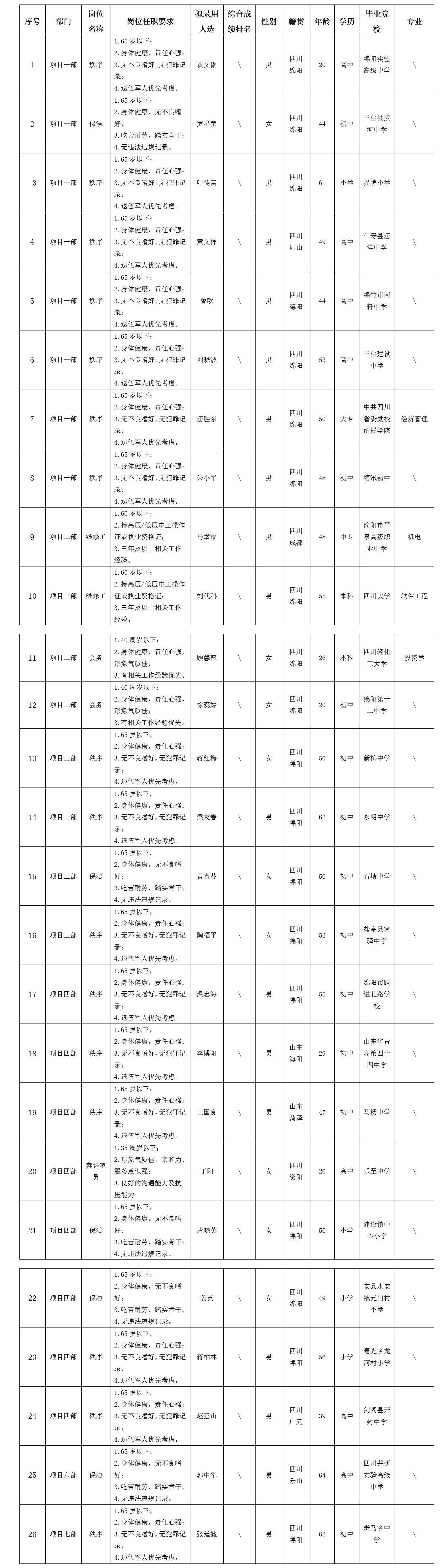 根據(jù)綿陽市康來物業(yè)服務有限公司發(fā)布的招聘公告及招聘相關規(guī)定,經(jīng)面試等程序,擬錄用賈文韜等同志到各項目部工作,現(xiàn)予以公示,具體情況如下: