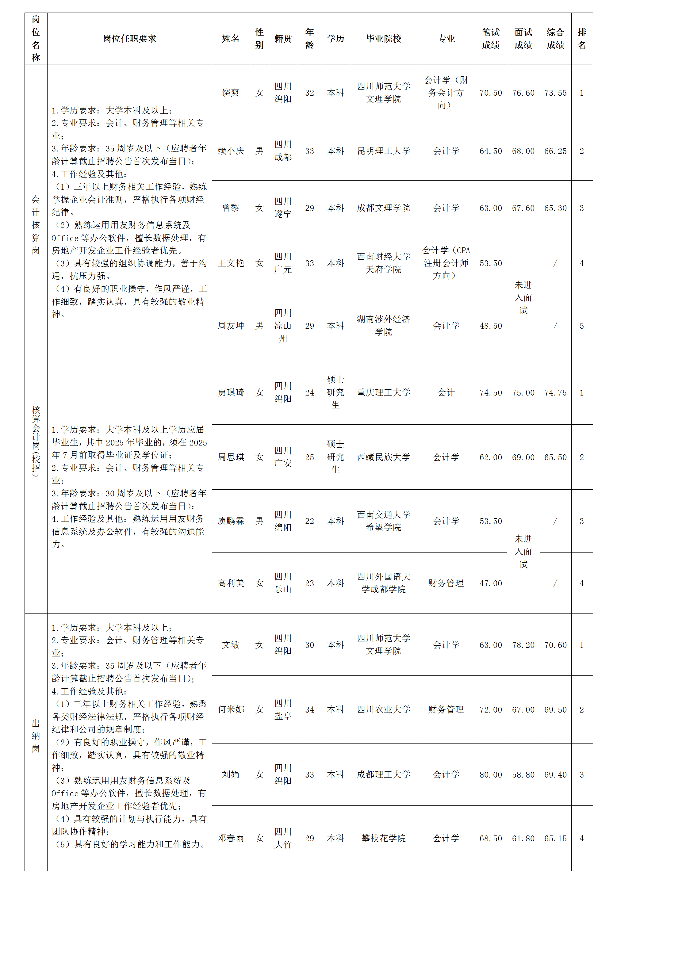 【公開招聘】綿陽市綿投置地有限公司關于會計核算崗等崗位測試成績的公示
