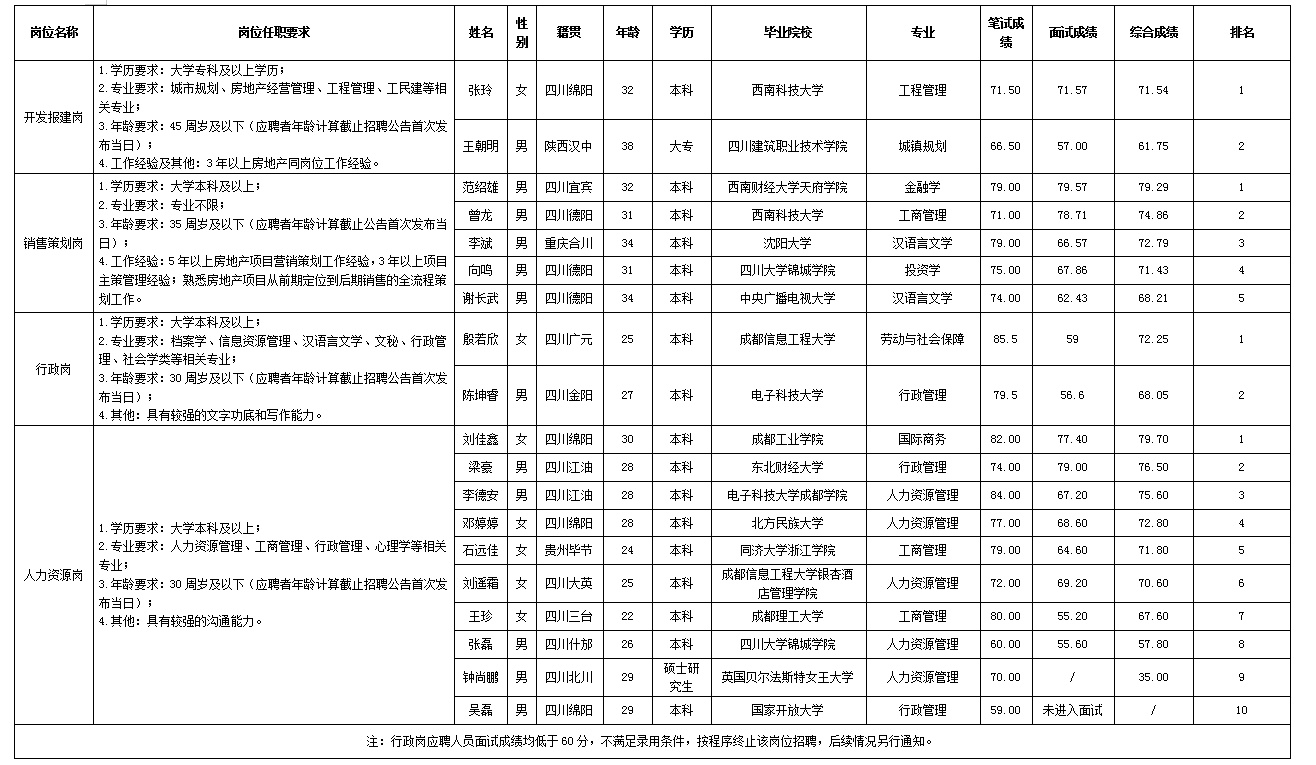 根據(jù)綿陽市綿投置地有限公司發(fā)布的招聘公告及招聘相關規(guī)定,經筆試、面試等程序,現(xiàn)將筆試、面試成績予以公示。