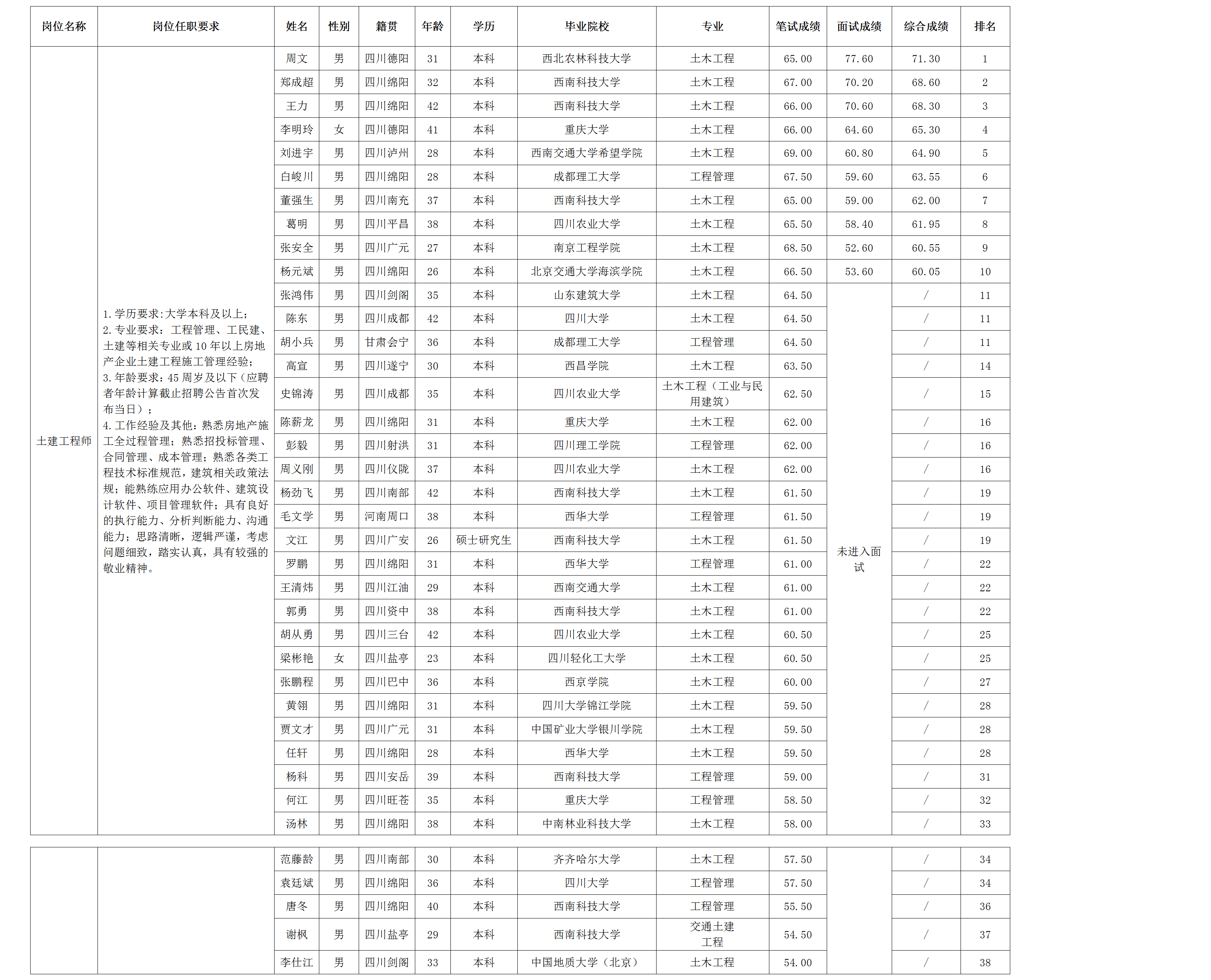 根據(jù)綿陽市綿投置地有限公司發(fā)布的招聘公告及招聘相關(guān)規(guī)定,經(jīng)筆試、面試等程序,現(xiàn)將筆試、面試成績予以公示。