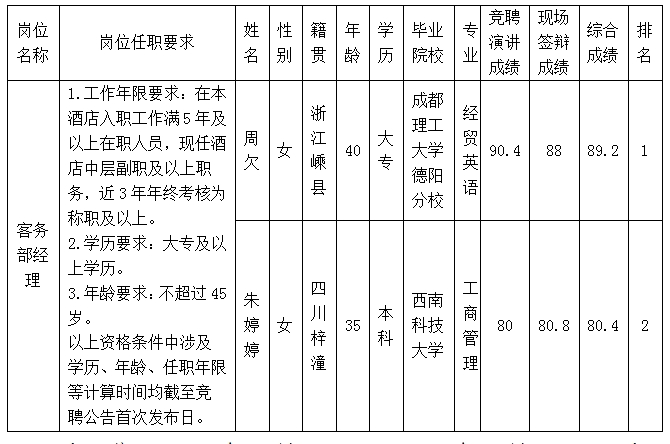 根據(jù)綿陽富樂山九洲國際酒店有限公司關于客務部經(jīng)理內(nèi)部競聘公告及招聘相關規(guī)定,經(jīng)競聘演講、現(xiàn)場答辯等程序,現(xiàn)將競聘成績予以公示。