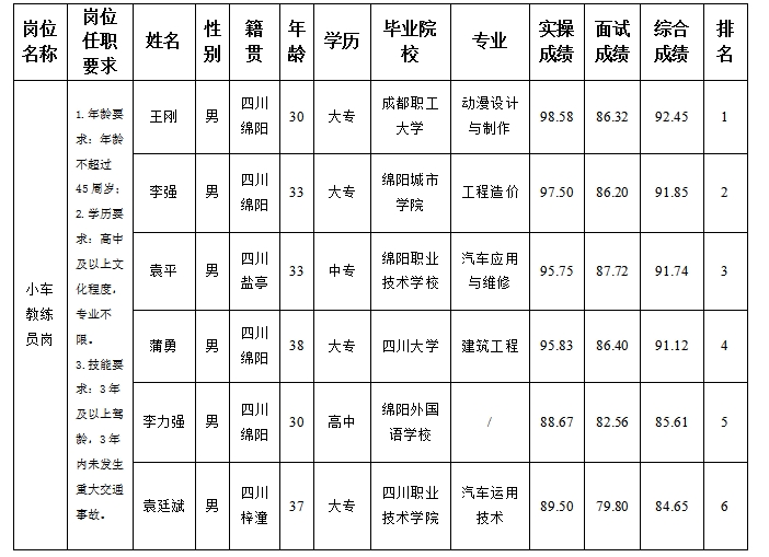 根據(jù)綿陽市汽車實(shí)驗(yàn)駕駛技術(shù)學(xué)校股份有限公司發(fā)布的招聘公告及招聘相關(guān)規(guī)定,經(jīng)面試、實(shí)操等程序,現(xiàn)將面試、實(shí)操成績予以公示。
