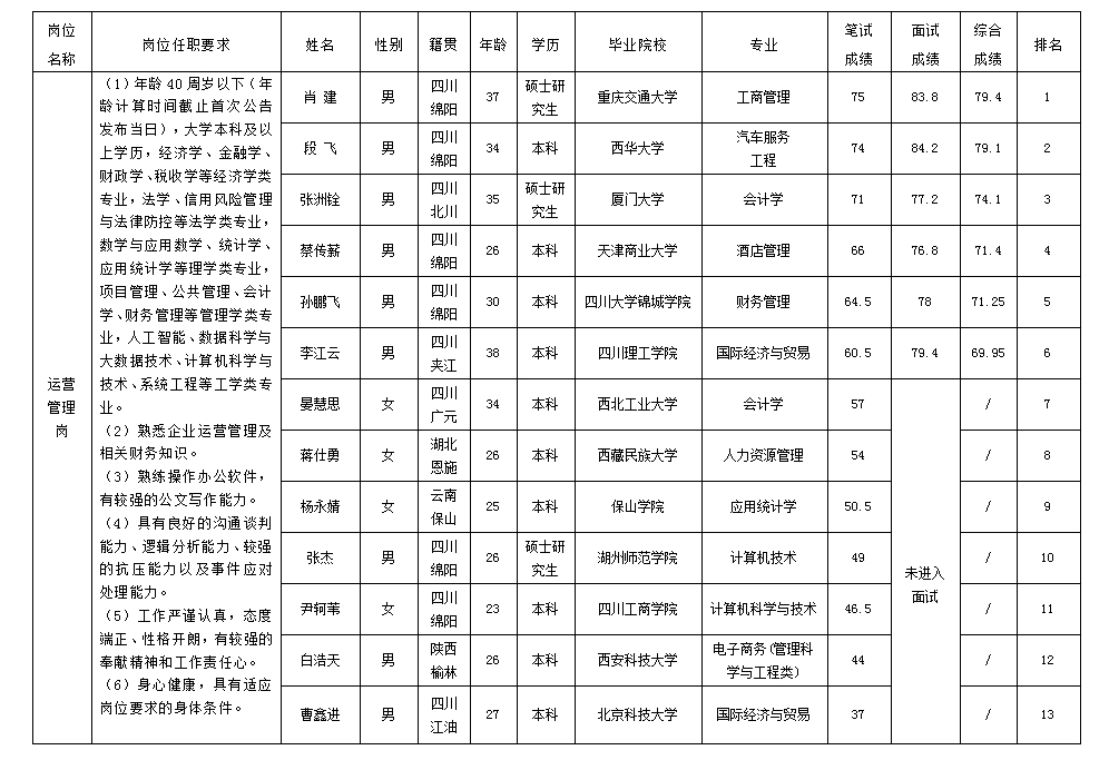 根據(jù)綿陽市投資控股(集團)有限公司發(fā)布的招聘公告及招聘相關規(guī)定,經(jīng)筆試、面試等程序,現(xiàn)將筆試(面試)成績予以公示。
