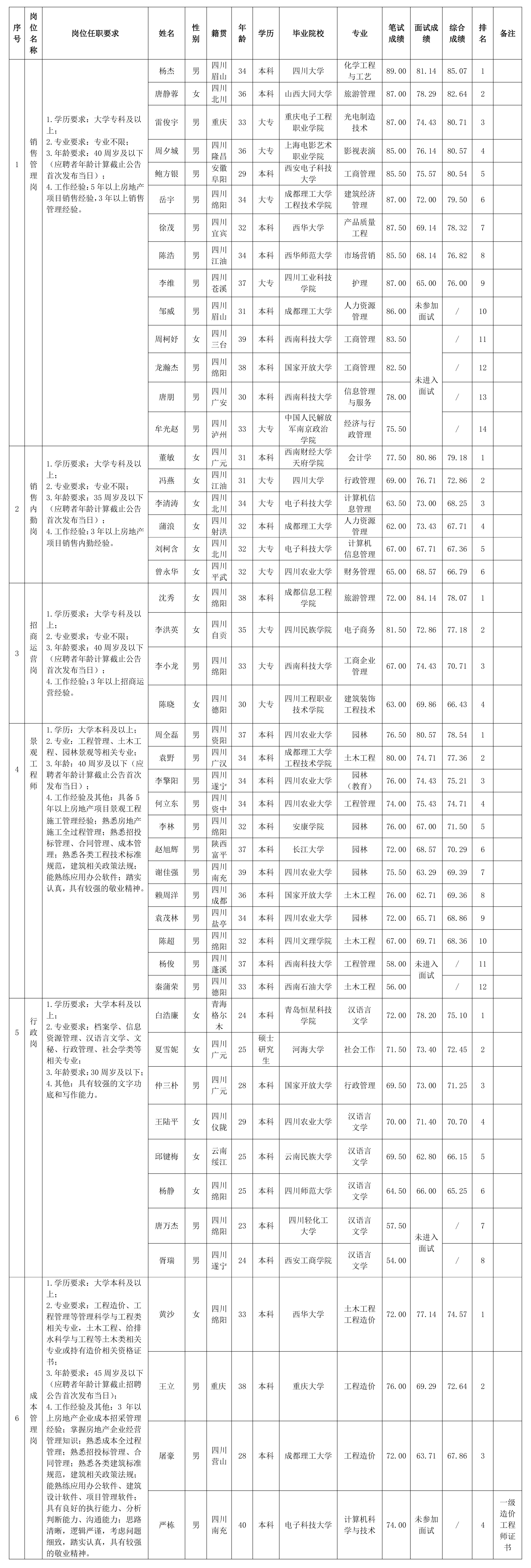 根據(jù)綿陽市綿投置地有限公司發(fā)布的招聘公告及招聘相關(guān)規(guī)定,經(jīng)筆試、面試等程序,現(xiàn)將筆試、面試成績予以公示。