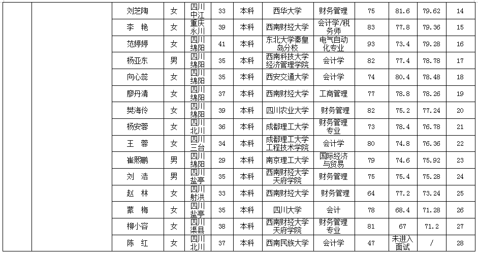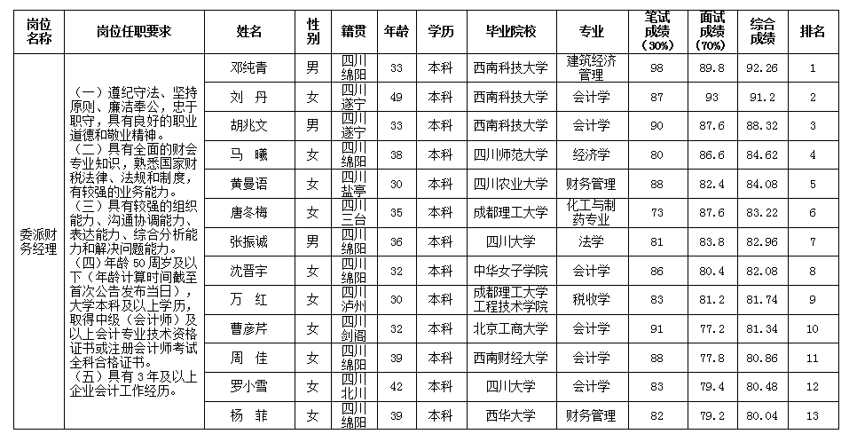 根據(jù)綿陽市投資控股(集團)有限公司發(fā)布的招聘公告及招聘相關規(guī)定,經筆試、面試等程序,現(xiàn)將筆試(面試)成績予以公示。