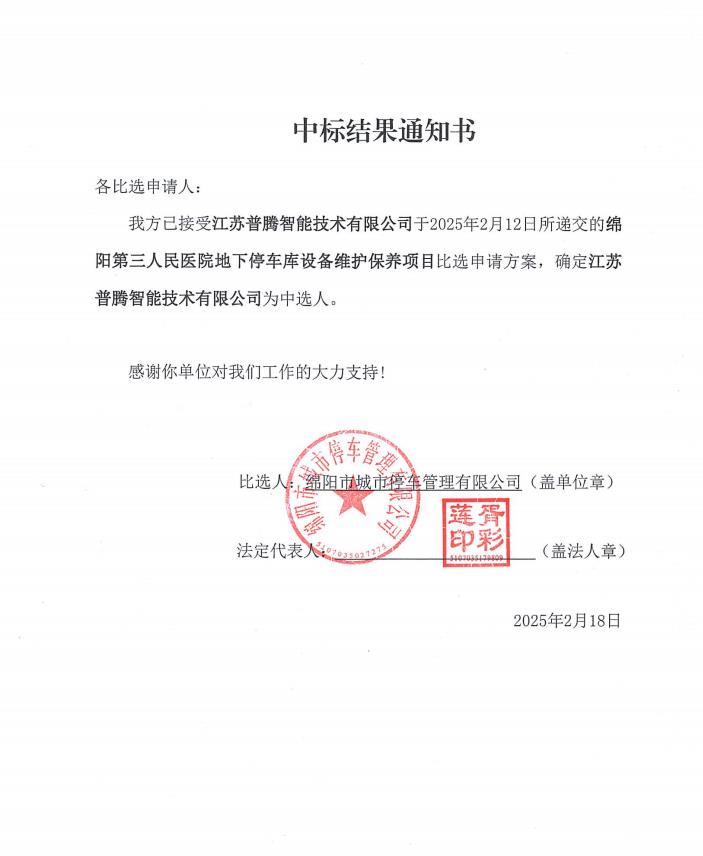綿陽第三人民醫(yī)院地下停車庫設(shè)備維護保養(yǎng)項目中標結(jié)果通知書