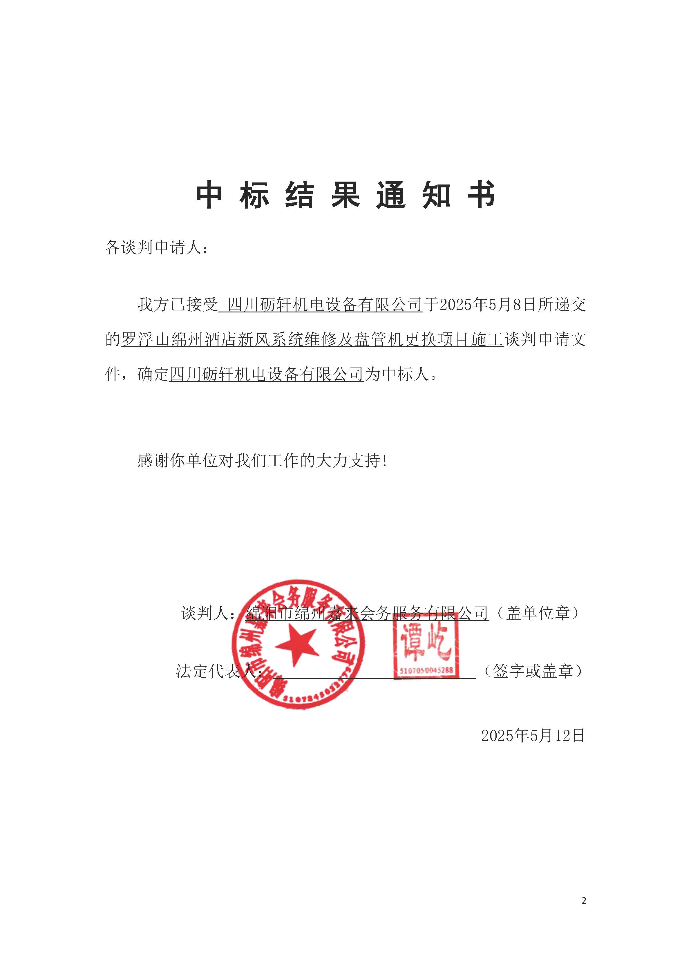 羅浮山綿州酒店新風(fēng)系統(tǒng)維修及盤管機(jī)更換項(xiàng)目施工中標(biāo)結(jié)果通知