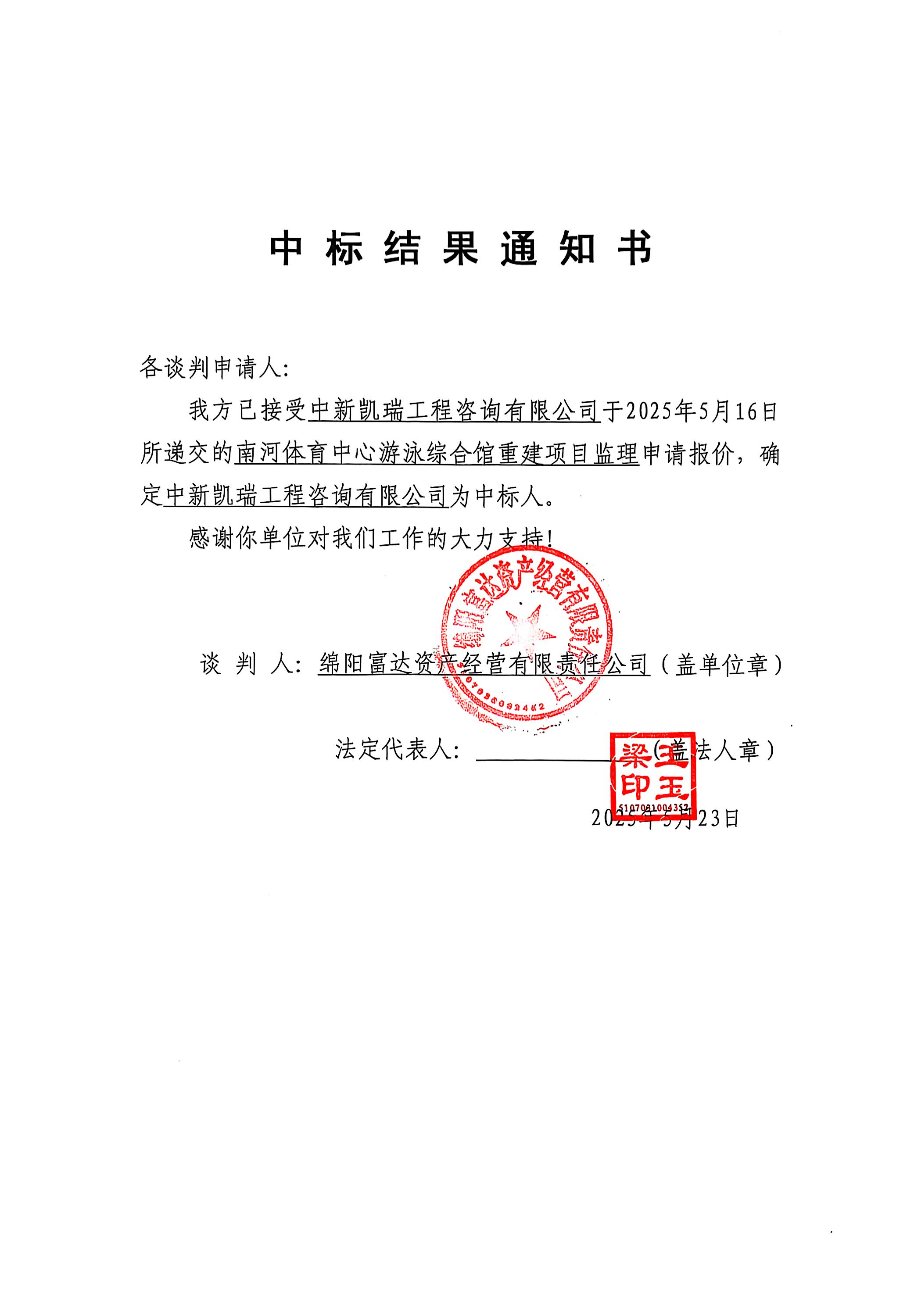 南河體育中心游泳綜合館重建項(xiàng)目監(jiān)理中標(biāo)結(jié)果通知
