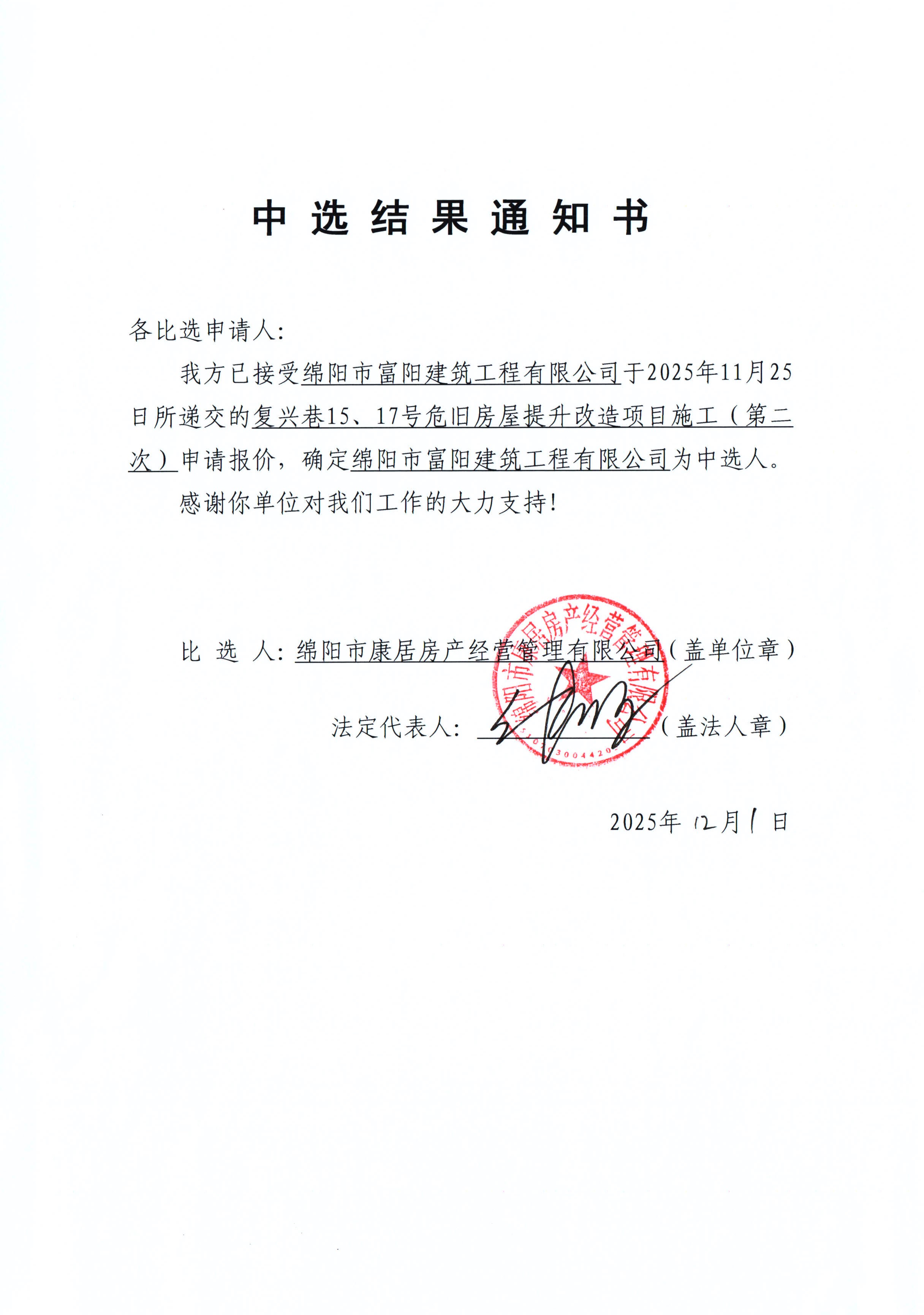 復興巷15、17號危舊房屋提升改造項目施工(第二次)中選結果通知