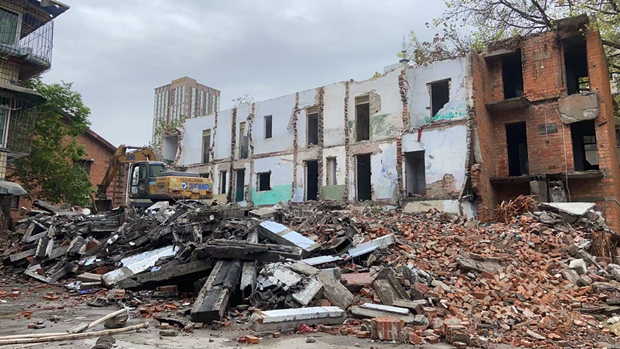 危房緊鄰周邊住宅,施工空間狹小,拆除難度極大。為確保拆除工作安全有序進(jìn)行,富達(dá)公司多次組織建筑、安全專家現(xiàn)場(chǎng)勘查,研究制定了“機(jī)械拆除為主,人工配合為輔”的精細(xì)化拆除方案。拆除現(xiàn)場(chǎng),工作人員設(shè)置警戒線封鎖拆除區(qū)域,專人疏導(dǎo)圍觀群眾,維護(hù)現(xiàn)場(chǎng)秩序。伴隨著挖掘機(jī)的轟鳴聲,危房樓體結(jié)構(gòu)在專業(yè)人員的精準(zhǔn)操控下逐步瓦解,同步實(shí)施灑水降塵措施,整個(gè)拆除過(guò)程安全、有序、環(huán)保。