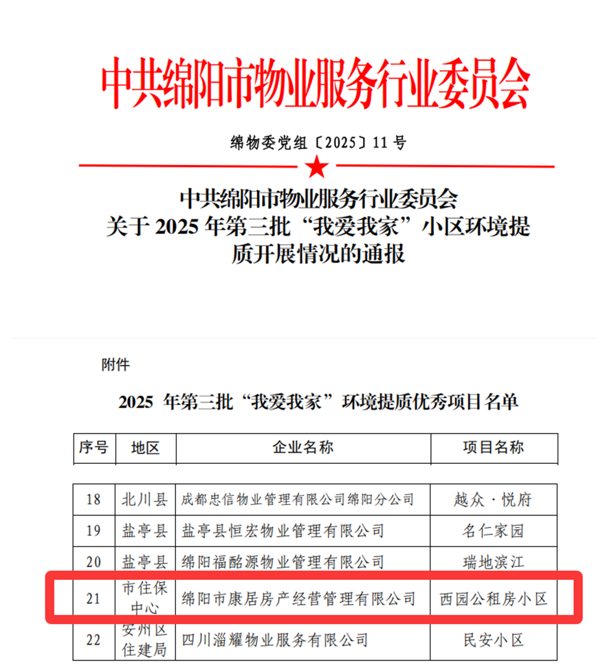 近日,綿陽市物業(yè)服務(wù)行業(yè)協(xié)會通報表揚(yáng)2025年第三批“我愛我家”小區(qū)環(huán)境提質(zhì)優(yōu)秀項目,西園公租房小區(qū)榜上有名。成績的取得,是對康居公司踐行“三心”服務(wù),即:以住戶為核心、與住戶貼心、讓住戶放心的有力佐證。